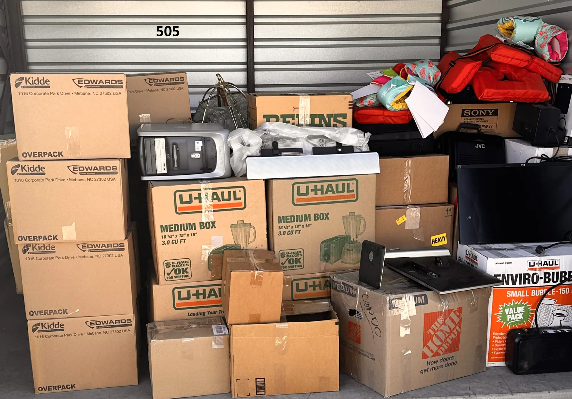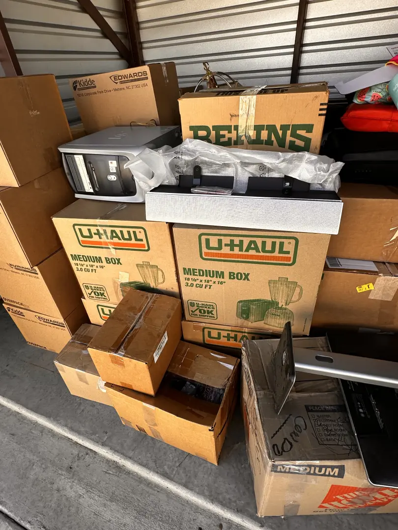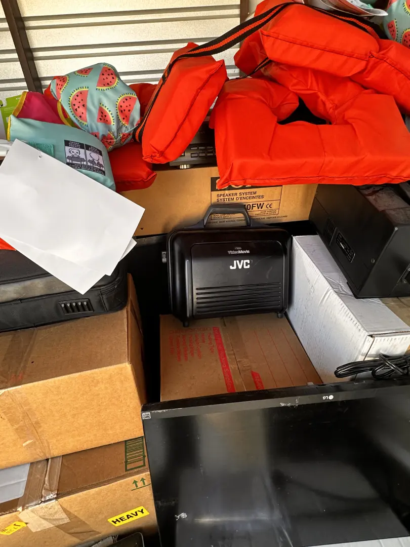 Moving boxes, computer and accessories, boating accessories, chandelier